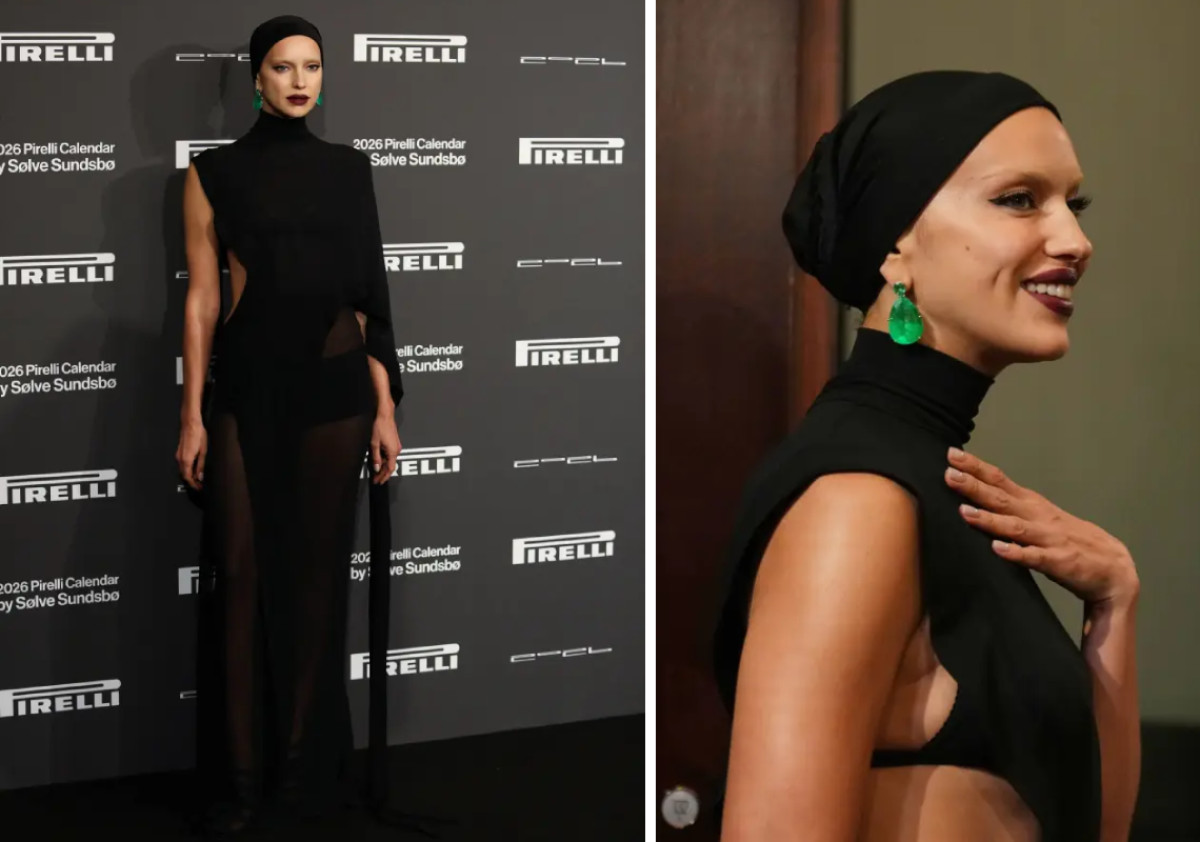 שייק צעדה על השטיח האדום בשמלה שחורה וסגורה יחסית, עם שרוול אחד בלבד, צווארון גולף וכיסוי ראש - מראה אלגנטי ומעודן, אבל עם טוויסט מפתיע. לא היה מי שלא שם לב לעגילי האמרלד הענקיים בצורת טיפה שעיטרו את אוזניה - תכשיט אחד כזה היה מספיק כדי להפוך למוקד הערב. ואם זה לא הספיק, שייק הפתיעה עם גבות מולבנות שהשלימו את המראה הדרמטי.