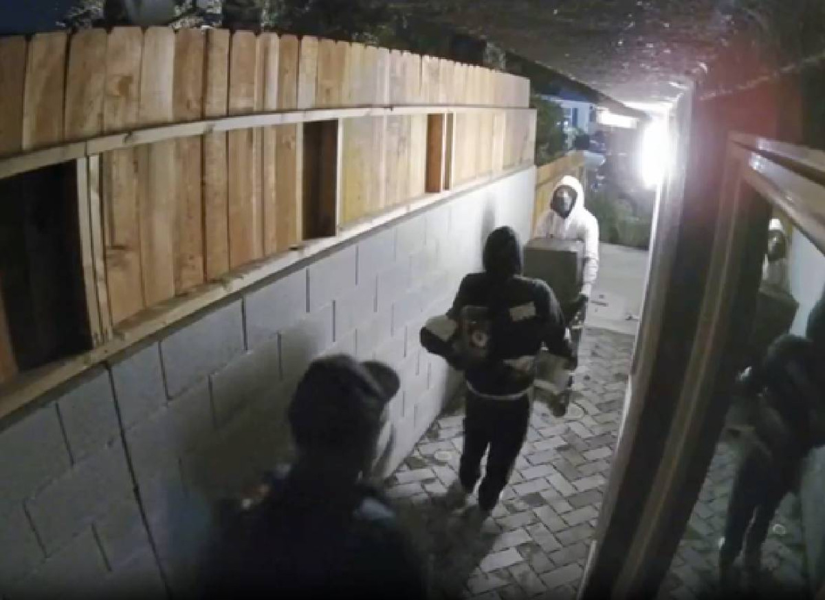 מצלמות האבטחה בבית תיעדו את רגע הבריחה: שלושה חשודים רעולי פנים — שני גברים ואישה, לפי ההערכה — נמלטים דרך סמטה צדדית בסביבות 20:30, כשהם נושאים תרמילי גב ותיקים גדולים, ככל הנראה מלאים בשלל נוסף. שניים מהם נראו מתקשים לשאת את הכספת הכבדה.