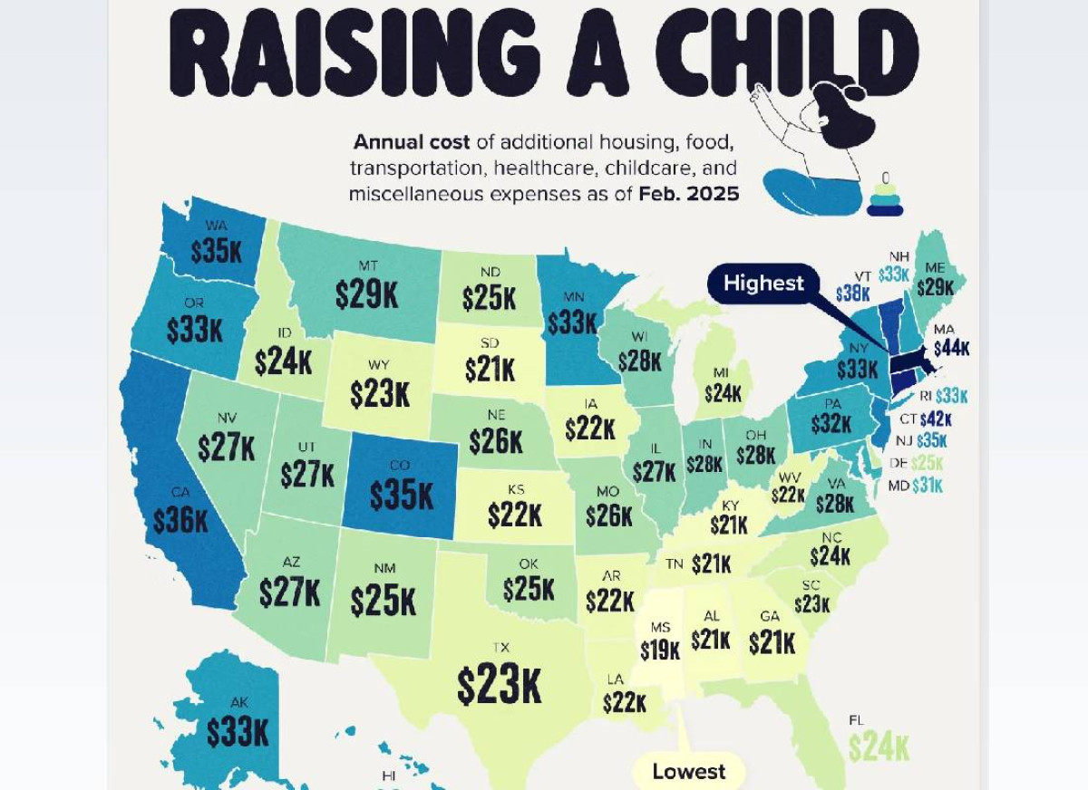 המחקר, שפורסם על ידי חברת “סמארט־אסֶט” (SmartAsset) ונערך בשיתוף “ויז'ואל קפיטליסט” (Visual Capitalist), בחן את העלויות הממוצעות של תמיכה בילד אחד בשנת 2025, כולל דיור, מזון, מעונות יום, בריאות, תחבורה ומסים. הממצאים מעידים לא רק על פערים עצומים בין אזורים שונים, אלא גם על מגמה מדאיגה של עליית מחירים חדה במדינות שבעבר נחשבו יחסית סבירות.