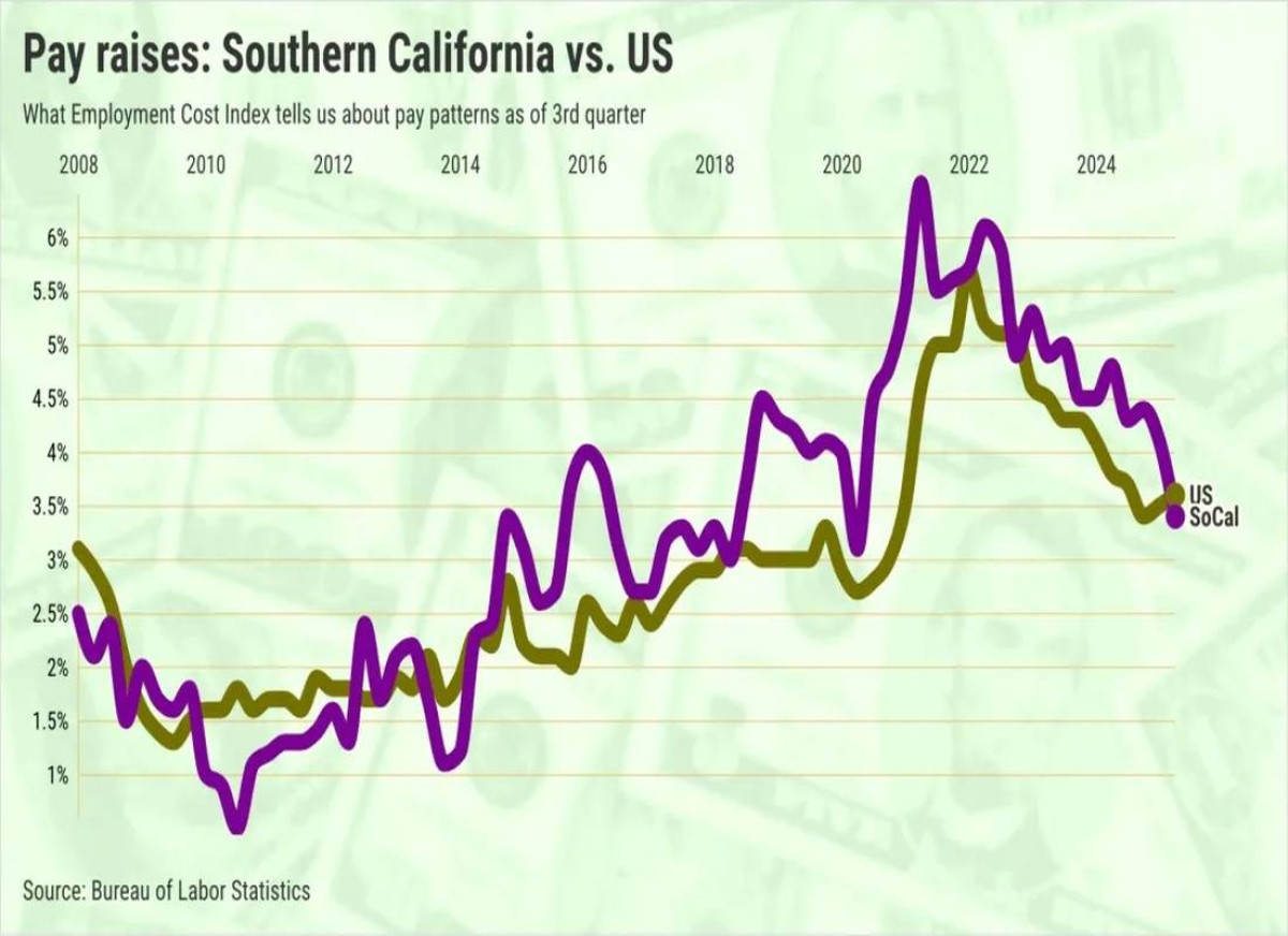 הנתונים מבוססים על מדד עלות התעסוקה, שעוקב אחר מה שמעסיקים משלמים לעובדים ב־15 אזורים בארצות הברית, ובהם אזור חמישה המחוזות בדרום קליפורניה. המדד המקומי, המודד שכר ומשכורות במחוזות לוס אנג'לס, אורנג', ריברסייד, סן ברנרדינו וונצורה, מראה כי התגמול צמח ברבעון השלישי בקצב שנתי של 3.4% בלבד.