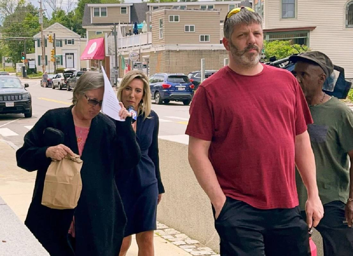דניס לודג', משמאל, מכסה את פניה עם תדפיס של כתב האישום נגדה כשהיא יוצאת מבית המשפט הפדרלי, 14 ביוני 2023, בקונקורד, ניו המפשייר, לאחר מעצרה באשמה הקשורה לתוכנית לכאורה לגניבה ומכירה של חלקי גוף שנתרמו.