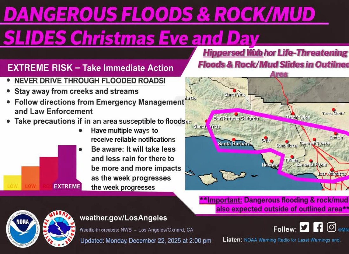 אזהרות שיטפונות הוכרזו עבור מחוזות לוס אנג'לס, ונטורה, ריברסייד, סן ברנרדינו ואורנג', לפחות עד ערב יום רביעי. התחזיות כוללות הצפות נרחבות, רוחות חזקות שעלולות להגיע למהירויות של 35 עד 55 מייל לשעה, ואף אפשרות לסופות רעמים. אזהרות ויועצי רוח חזקה כבר נכנסו לתוקף באזורים המועדים לכך.