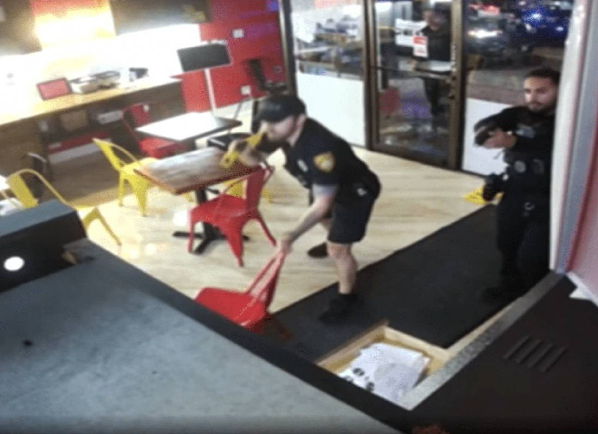 לאחר שנכנס למעדנייה, תיעוד המצלמות מציג את פייק מוזג לעצמו משקה, מתעסק ביחידת יישון הבשר, מחטט במגירה ונע לכיוון קופת הרישום, עד להגעת כוחות המשטרה. בסרטון נראים השוטרים כשהם עוצרים אותו בתוך העסק באיומי נשק.