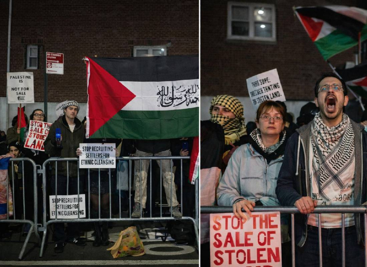 את המחאה הובילה קבוצת הפעילים פלסטין־עודה, שקראה למשתתפיה להגיע רעולי פנים ולפעול תחת הסיסמה “אין מתנחלים על אדמה גנובה”. זו אינה הפעם הראשונה שהקבוצה פועלת מול מוסדות יהודיים: בנובמבר האחרון היא הובילה מחאה דומה מחוץ לבית הכנסת פארק איסט במנהטן, שם נשמעו כינויים משפילים ואיומים כלפי יהודים שהגיעו לאירוע קהילתי.