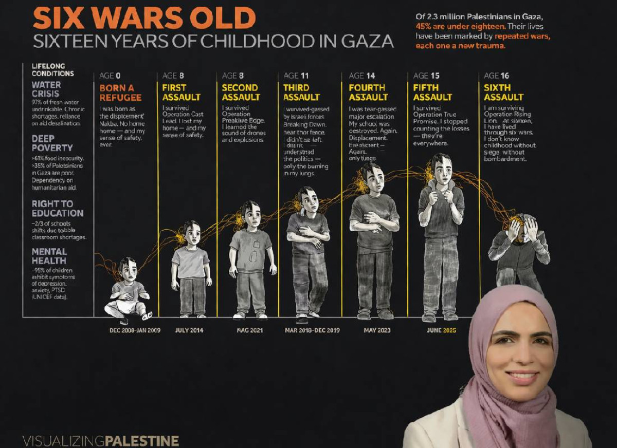 ד"ר וים חמודה הייתה אחת מכמה מציגים במהלך ישיבת קבוצת העבודה, על רקע איור המפרט את האירועים הטראומטיים שחווה ילד פלסטיני בעזה, מלידה ועד גיל 16, כולל שש תקיפות צבאיות ומשברים מתמשכים כמו מחסור במים וחסימות.