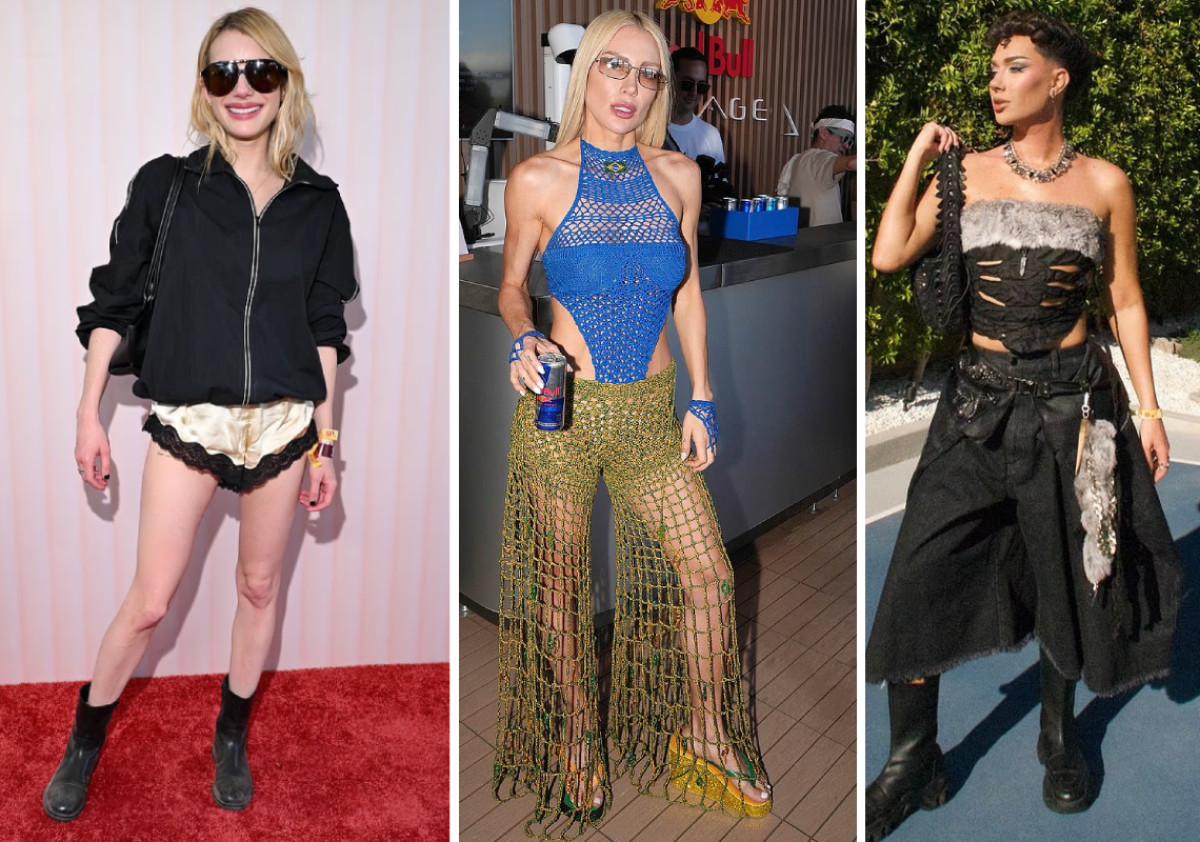 פריס הילטון, שהגדירה את הלוק שלה כ'קאווגירל ברבי', הגיעה בסט אדום-ורוד בוהק עם שפע קישוטים מתנגשים - פאייטים, פפיונים ונוצות - שילוב שבלט מאוד בשטח. גם ג'יימס צ'רלס, יוטיובר ואמן איפור אמריקאי, בחר במראה כהה וכבד יחסית למדבר: חצאית ג'ינס שחורה בגזרת A, מחוך סטרפלס עם דיטיילים דמויי פרווה, מגפיים מסיביים ותיק צד.